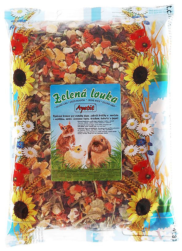 vojtěška sušená, vločky kukuřičné, vločky hrachové, mrkev sušená, vločky fazolové, červená řepa
