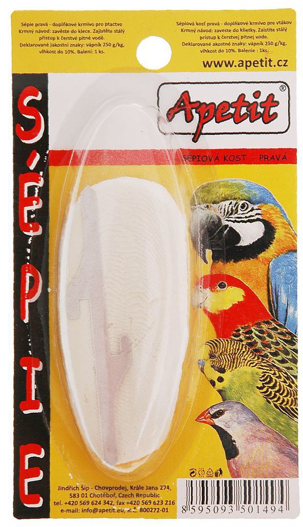 Doplňkové krmivo pro exoty a papoušky, které dodává organismu v přírodní formě kalcium, ostatní minerální látky a stopové prvky potřebné pro udržení dobré kondice vašeho chovance. Účinná pomůcka při obrušování zobáku.