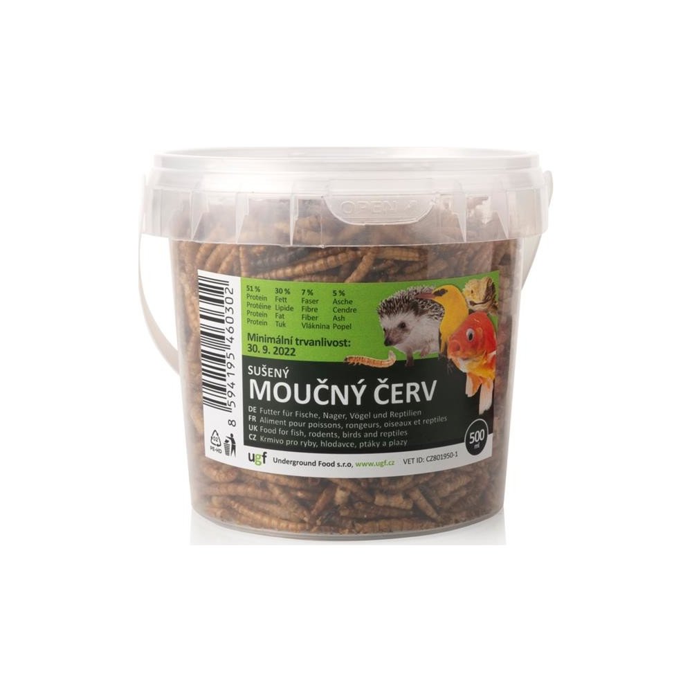 Moučný červ sušený. Doplňkové krmivo pro ptactvo, ryby, malé savce a plazy. Potemník moučný obsahuje potřebné množství taurinu, je zdrojem proteinu, probiotické vlákniny, vitamínů, minerálů a stopových prvků.