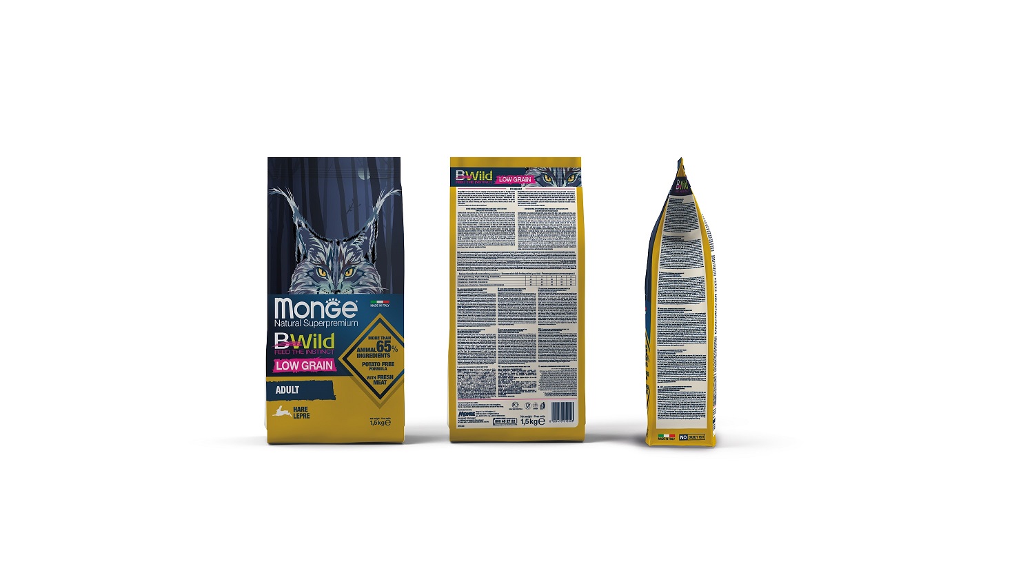 zajíc (15% čerstvého masa, 35% sušeného masa), žlutý hrách, živočišný tuk (99,5% kuřecí tuk, konzervovaný přírodními antioxidanty), tapiokový škrob, rýže, ovesné vločky, řepné řízky, hydrolyzované živočišné bílkoviny, pivovarské kvasnice (zdroj MOC a vitaminu B12), vejce, lněné semínka (1%), sušená mrkev (1%), sušená rajčata (1%), nerozpustná hrachová vláknina, taurin, juka schidigera, spireina, ananasový stvol, sušené borůvky, sušené brusinky, sušené maliny, XOS (xylo-oligosacharidy 3g/kg).