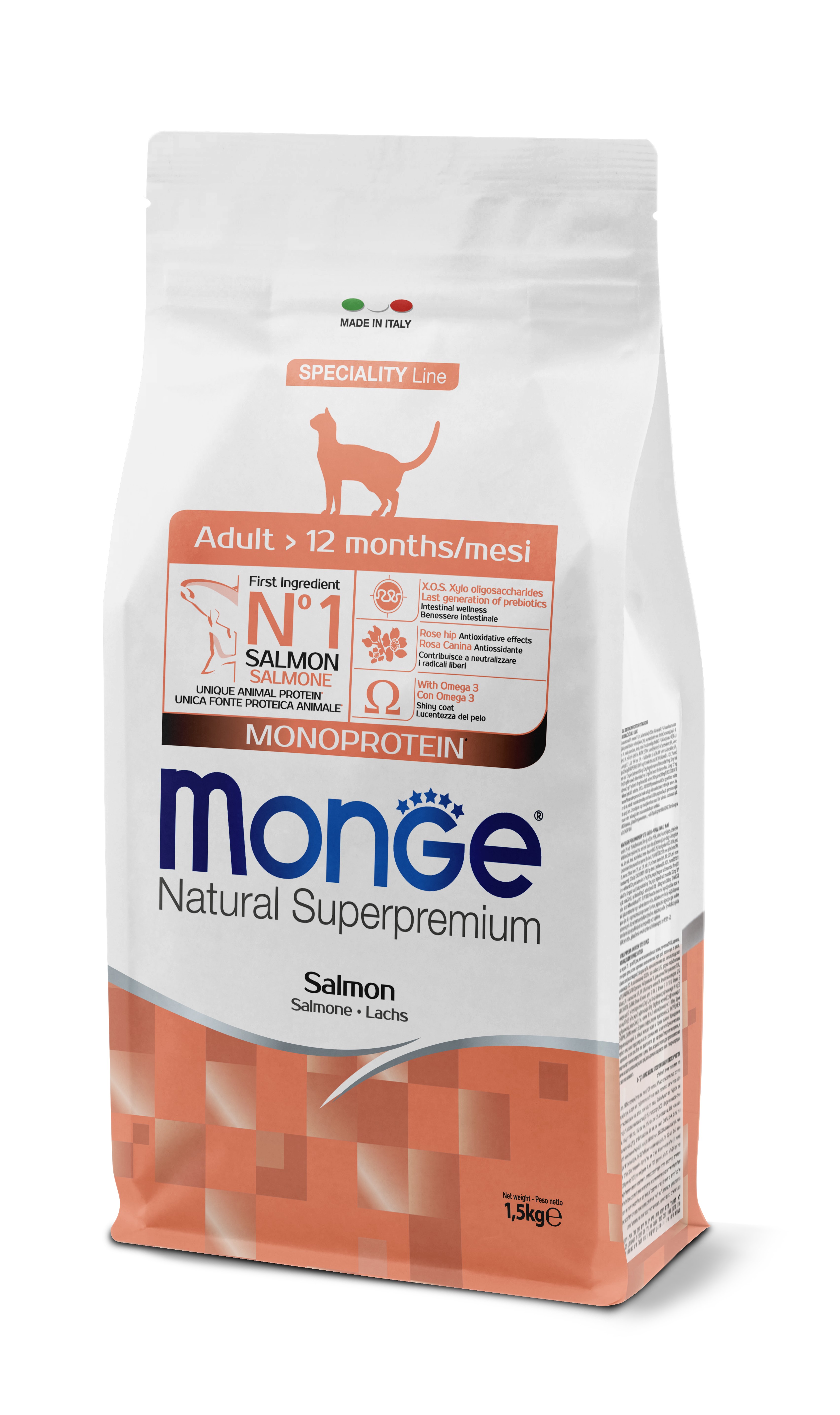 Monge Natural Superpremium Monoprotein* Adult Cat Losos je kompletní a vyvážené krmivo pro dospělé kočky. Produkt formulovaný s jediným zdrojem živočišných bílkovin, jedinou složkou je losos, vyznačuje se svou stravitelností a chutností díky zahrnutí čerstvých ryb. Formulace je obohacena o XOS (xylo-oligosacharidy), prebiotika nové generace pro podporu střevního zdraví. Zahrnutí vybraných ingrediencí, jako je šípek s antioxidačními sloučeninami pro neutralizaci volných radikálů, a yucca schidigera pro omezení střevních pachů, je výsledkem výzkumu Made in Italy zaměřeného na podporu kvality života vaší kočky. Formulováno s omega-3 mastnými kyselinami pro lesklou srst. Bez přidaných barviv a umělých konzervačních látek.