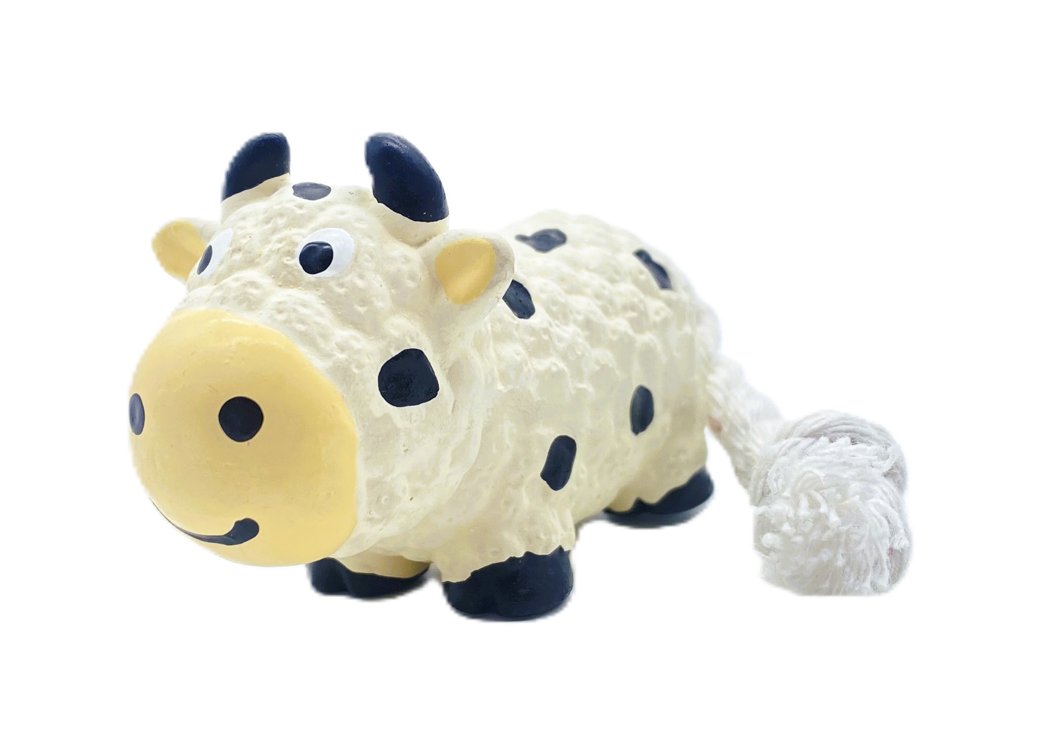 Latexová hračka pro malé pejsky ve tvaru krávy s ocáskem z provazu.