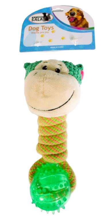 Bavlněné přetahovadlo pro psy s plyšovým zvířátkem, zakončené míčkem z termoplastické gumy.