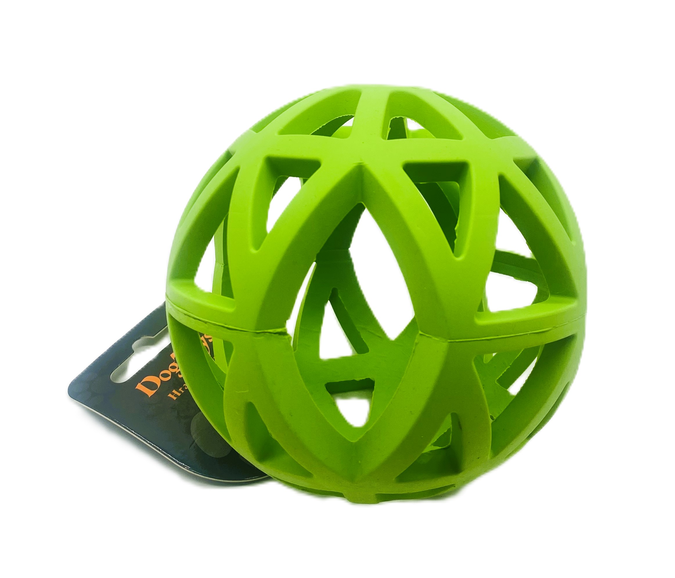 Děrovaný míč vyrobený z odolné gumy, lze plnit pamlsky. Měkký ale odolný míček který se při skousnutí deformuje a po uvolnění se vrátí do původního tvaru.