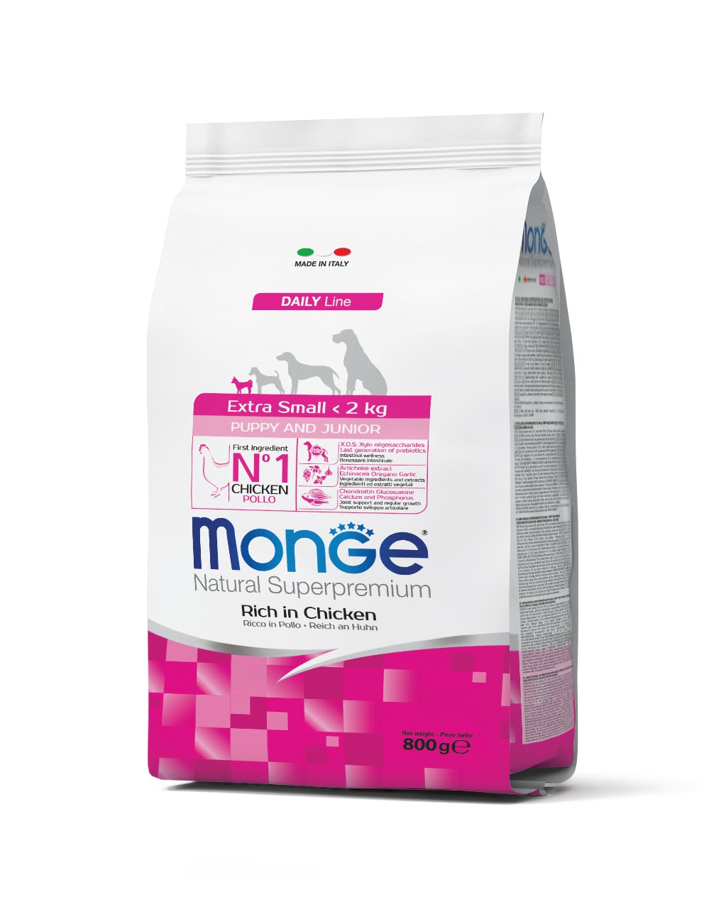 Kompletní superprémiové krmivo pro štěňata velmi malých ras s čerstvým kuřecím masem a rýží, obsahuje glukosamin a chondroitin sulfát.