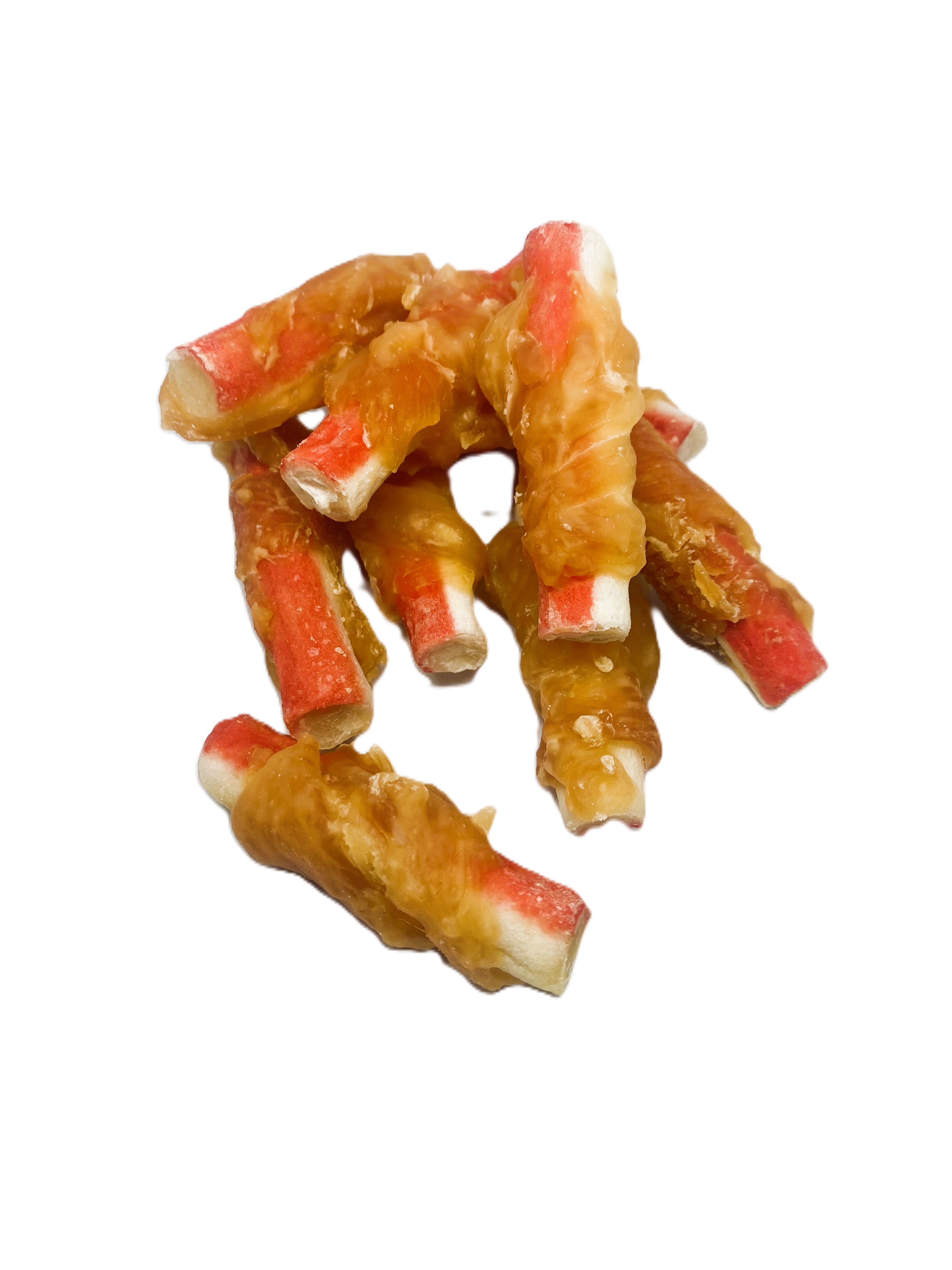 Krabí tyčinka dlouhá cca 6cm, která je omotaná kuřecím měkkým masem.